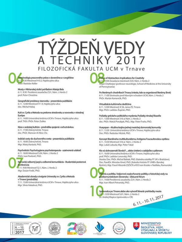 Ani tento rok nechýbali na našom Týždni vedy a techniky 2017 rozmanité prednášky populárneho, ale aj vedeckého charakteru. Diskutovali sme na rôzne témy o histórii, stredoveku a novoveku, Indii, Mexiku či arabskej kultúre. Pochutili sme si na tradičnom arabskom čaji a káve. Prešli sme sa po literárnych chodníkoch Trnavy a polemizovali o terminológii pracovného práva v slovenčine a v angličtine.