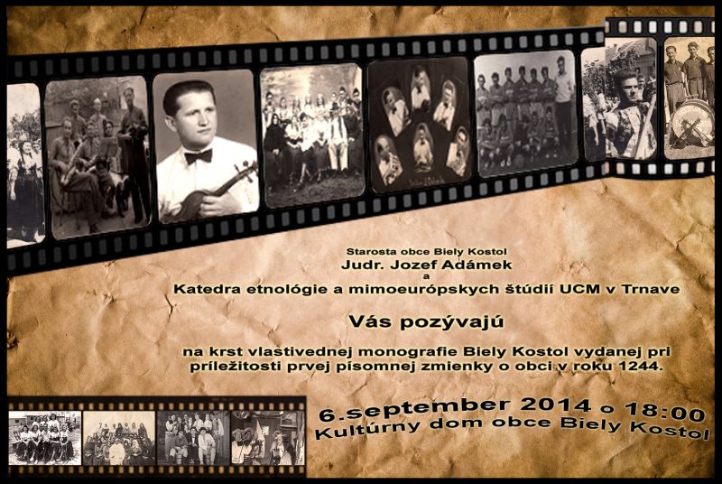 Starosta obce Biely Kostol v spolupráci s Katedrou etnológie a mimoeurópskych štúdií FF UCM Vás srdečne pozývajú na krst vlastivednej monografie Biely Kostol, ktorý sa uskutoční dňa 6. septembra 2014 o 18.00 hod. v Kultúrnom dome obce Biely Kostol.