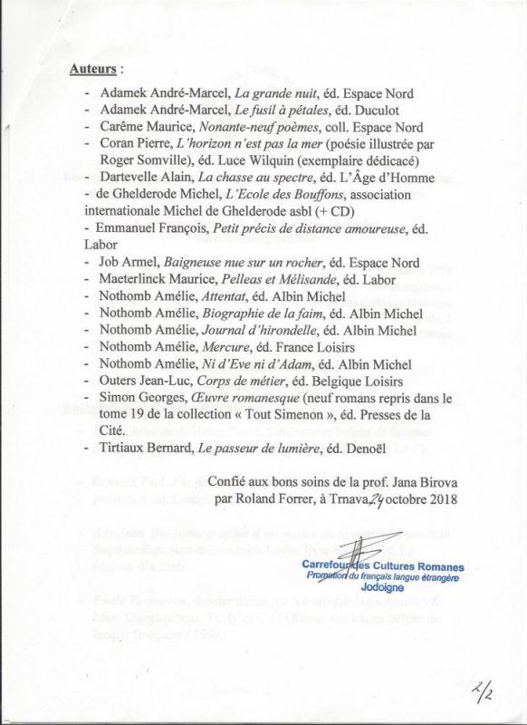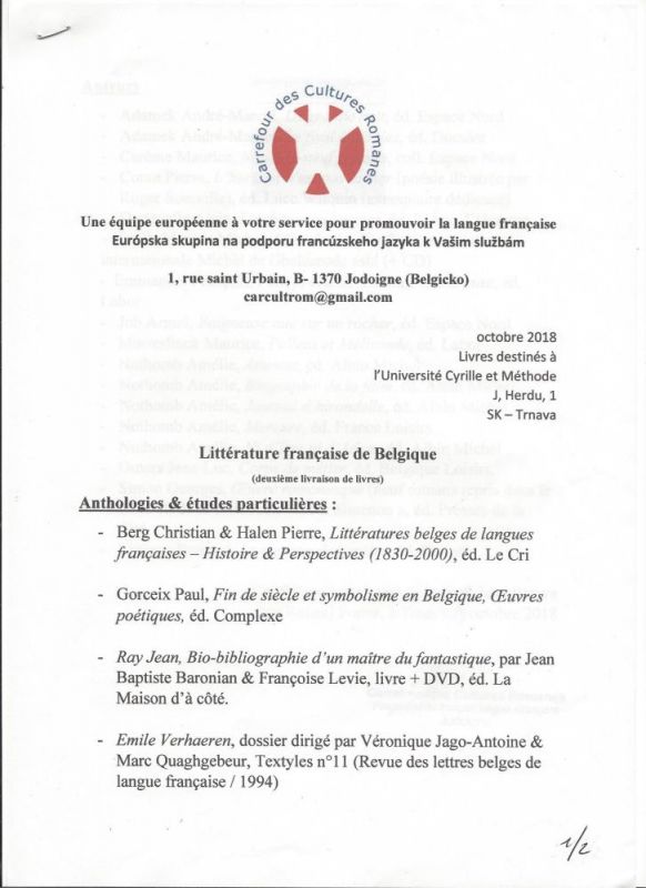 Dňa 23. 10. 2018 navštívil FF UCM v Trnave belgický profesor a novinár Roland Forrer, riaditeľ asociácie Carrefour des cultures romanes, ktorý každoročne zásobuje Slovenskú asociáciu učiteľov francúzštiny na Slovensku ako aj Národné kolo olympiád vo francúzskom jazyku. Priniesol do knižničného fondu už po druhýkrát rozličné knihy napísané belgickými autormi. Knižnica UCM tak získava jedinečné materiály, ktoré nie sú dostupné v žiadnom knižničnom fonde na Slovensku. Veríme, že knižnicu UCM využijú nielen vysokoškolskí študenti a učitelia, ale že ju navštívia aj žiaci stredných či základných škôl.