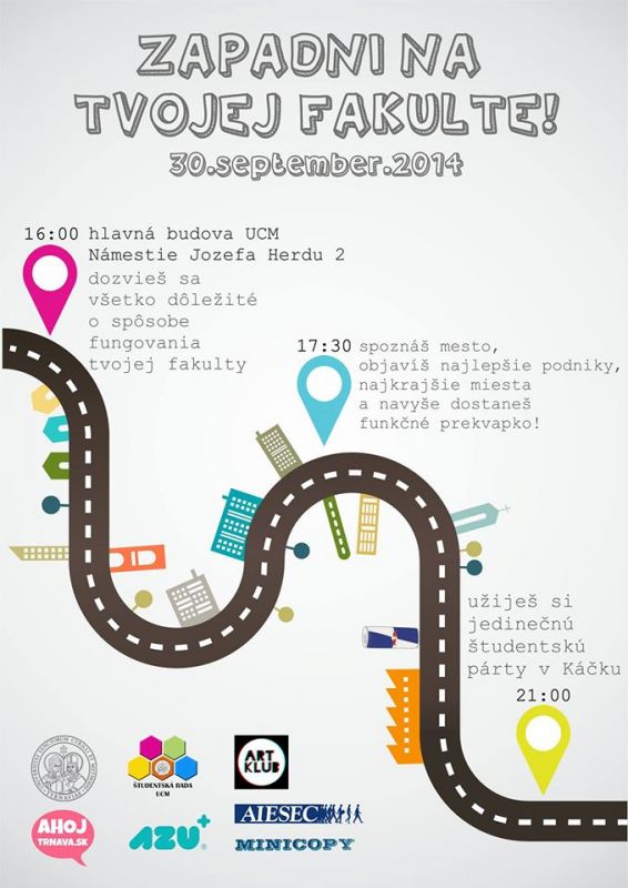 Ahojte prváci UCM, 30.9. 2014 o 16:00 sa dozviete o svojej novej škole viac. Študentská rada UCM a AIESEC Trnava organizujú event, na ktorom sa dozviete všetky dôležité informácie nielen formálneho charakteru.