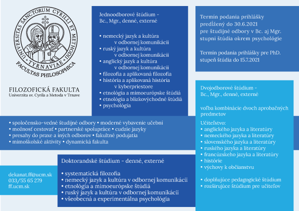 Prijímacie konanie na akademický rok 2021/2022 sa predlžuje do 30.06.2021 - okrem psychológie.