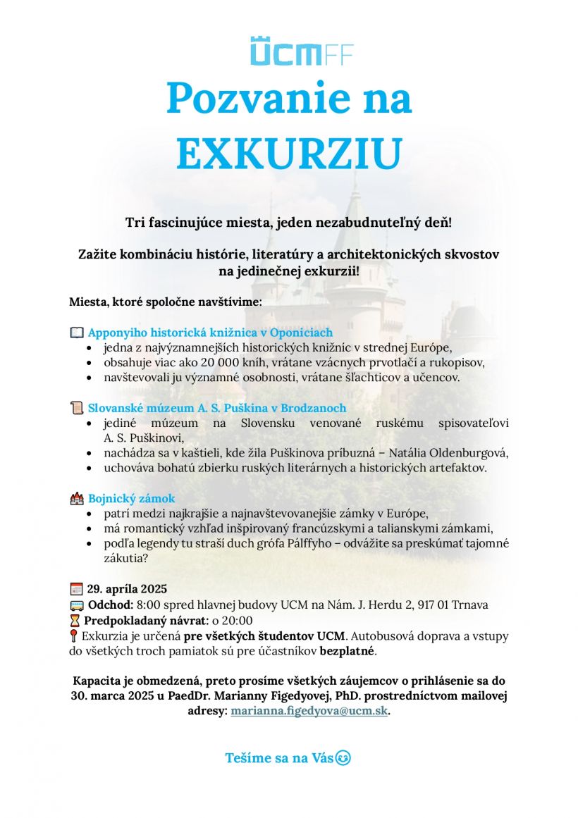 19.03.2025 Pozvanie na EXKURZIU . Vložil: Lukáš Kurajda Zodpovedná osoba: doc. PhDr. Andrea Grominová, PhD. Zdroj: Katedra rusistiky FF UCM Návrat späť