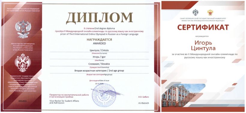 Podľa bodového rebríčka v druhej kategórii zaujalo 1. miesto 83 ľudí z 39 krajín, 2. miesto 159 ľudí z 52 krajín a 3. miesto 176 ľudí z 58 krajín. Jedným z účastníkov olympiády bol aj doktorand Katedry rusistiky FF UCM v Trnave Mgr. Igor Cintula, ktorý podľa bodového rebríčka obsadil 2. miesto. Spolu s ostatnými víťazmi má možnosť bezplatne absolvovať štátne skúšky z ruštiny ako cudzieho jazyka na Petrohradskej štátnej univerzite a získať medzinárodne uznávané ruské štátne osvedčenie, ktoré je úradným dokumentom potvrdzujúcim úroveň ovládania ruského jazyka. Igorovi srdečne blahoželáme a prajeme veľa úspechov v ďalšom štúdiu :)