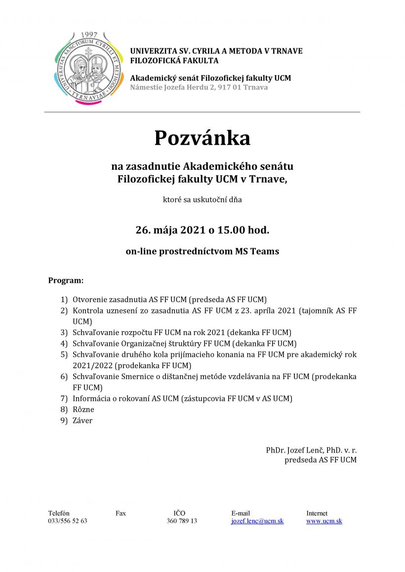 Pozývame Vás na zasadnutie Akademického senátu Filozofickej fakulty UCM v Trnave, ktoré sa uskutoční dňa 26. mája 2021 o 15.00 hod. on-line prostredníctvom MS Teams.