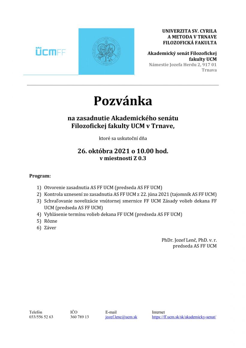 Pozývame Vás na zasadnutie Akademického senátu Filozofickej fakulty UCM v Trnave, ktoré sa uskutoční dňa 26. októbra 2021 o 10.00 hod. v miestnosti Z 0.3