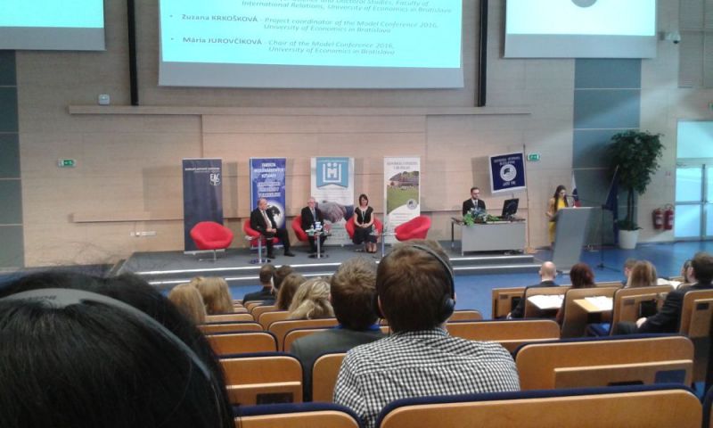 V aule bratislavskej Ekonomickej univerzity sa v stredu 13. apríla 2016 konal 9. ročník Modelovej konferencie. Na jej príprave sa podieľali študenti Fakulty medzinárodných vzťahov v spolupráci so študentmi iných odborov, ako napríklad žurnalistika, masmediálna komunikácia, filmová tvorba, či prekladateľstvo a tlmočníctvo. Modelová konferencia im poskytuje možnosť vyskúšať si ako v praxi využiť nadobudnuté teoretické poznatky a zdokonaliť svoje argumentačné a vyjednávacie schopnosti.